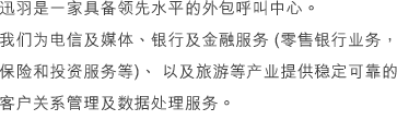 迅羽公司累積了眾多行業(yè)豐富的知識和經(jīng)驗,通過科學的運營管理模式和逐漸完善的執(zhí)行手段,確保客戶的規(guī)劃和策略在呼叫中心服務中能真正得到保障。